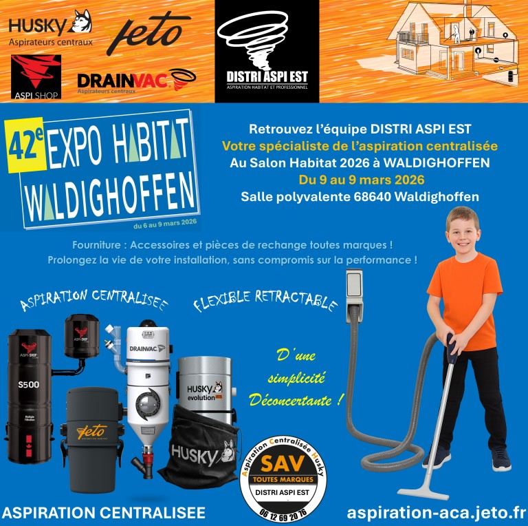 Du 6 au 9 mars 2026, l’équipe DISTRI ASPI EST / ACA sera présente au Salon Habitat de Waldighoffen pour faire découvrir l’aspiration centralisée en situation réelle. Démonstrations en direct, conseils personnalisés, étude de projet et devis sur mesure seront proposés aux visiteurs, ainsi que des accessoires et un accompagnement installation/SAV.